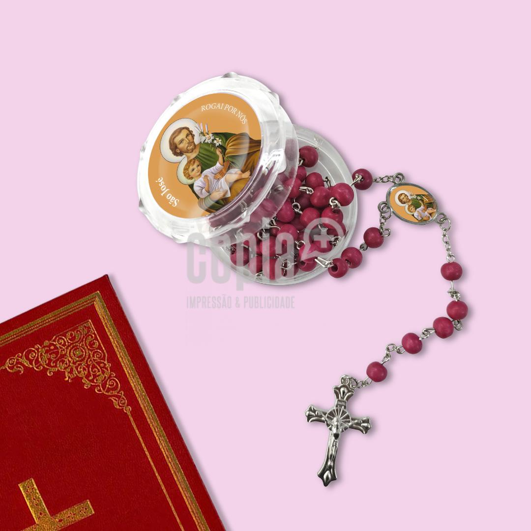 Terço de madeira com imagem na caixa e no pendente do terço.